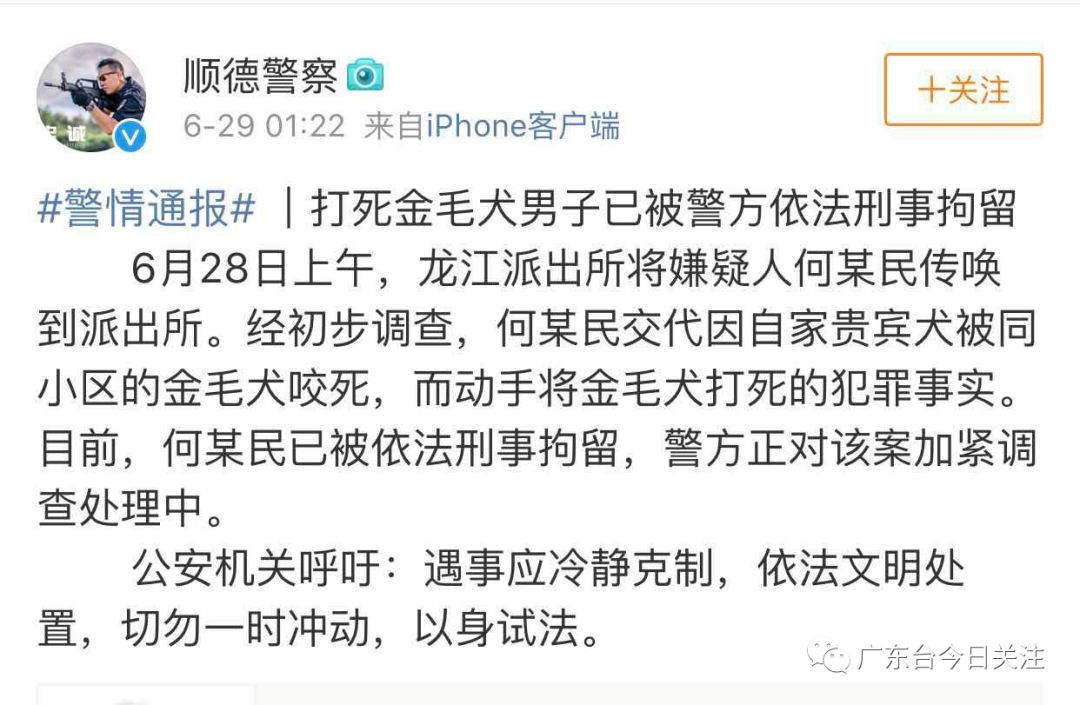 今天上午,佛山顺德警方通报。6月28日上午,龙江派出所接报后,已经将打狗致死的嫌疑人何某民传唤到派出所。