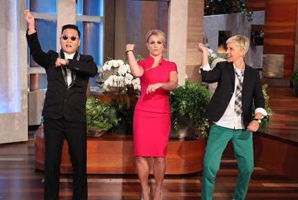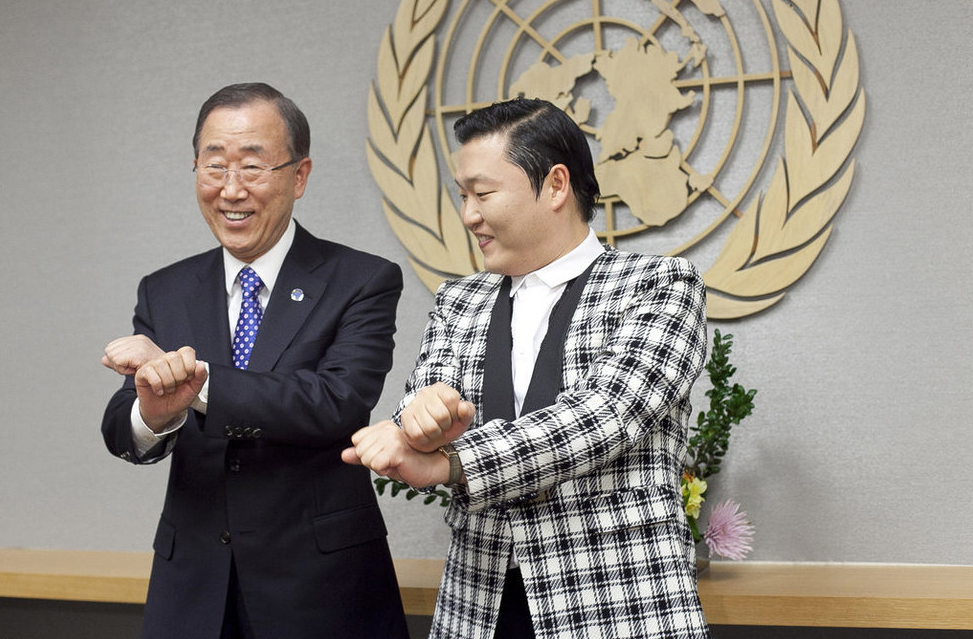 在这里,世界上最出名的两位韩国人一起大跳骑马舞,潘基文还赞扬鸟叔的这首歌“为世界和平带来了力量”。