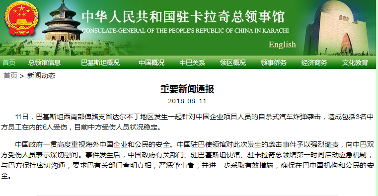 中国驻巴基斯坦大使馆证实,一名中国公民在这起袭击事件中受轻伤。中国驻巴使馆随后发表声明,强烈谴责这一恐怖主义行径,向伤者致以诚挚慰问,并对无辜遇难者表示深切哀悼。声明说,中国驻巴使馆已在第一时间启动应急预案,要求巴方妥善救治伤员,对袭击事件进行彻查,严惩凶手;同时要求巴各级相关部门采取切实有效措施,加快推进加强版全流程安保措施和升级版安保合作机制,确保类似事件不再发生。
