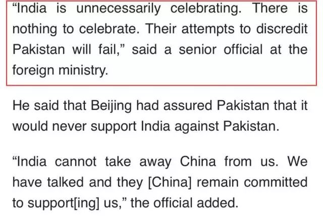 巴基斯坦《国民报》5日的报道反驳了印媒的说法。报道称巴基斯坦与中国巴基斯坦与中国,印度官员和媒体试图向世人兜售宣言中对“虔诚军”和“穆罕默德军”的关注,以作为“巴基斯坦外交失败”的佐证。但印方忽略了一个事实,即巴基斯坦此前已将上述两个组织认定为反对和平的组织,并对其予以禁止。印方一直指责这两个组织在印度境内实施恐怖活动,要求巴基斯坦进行打击。印方认为这两个组织设在巴基斯坦,其活动得到了巴安全机构“不公开的支持”,但这一说法被巴基斯坦否认。巴基斯坦外交部一名高级官员对《国民报》表示,印度不必庆祝外交胜利,也没什么值得庆祝的。印方试图诋毁巴基斯坦的举动将面临失败。他说,“印度不可能把中国带走。我们(巴中)谈过,他们(中国)仍然致力于支持我们。”