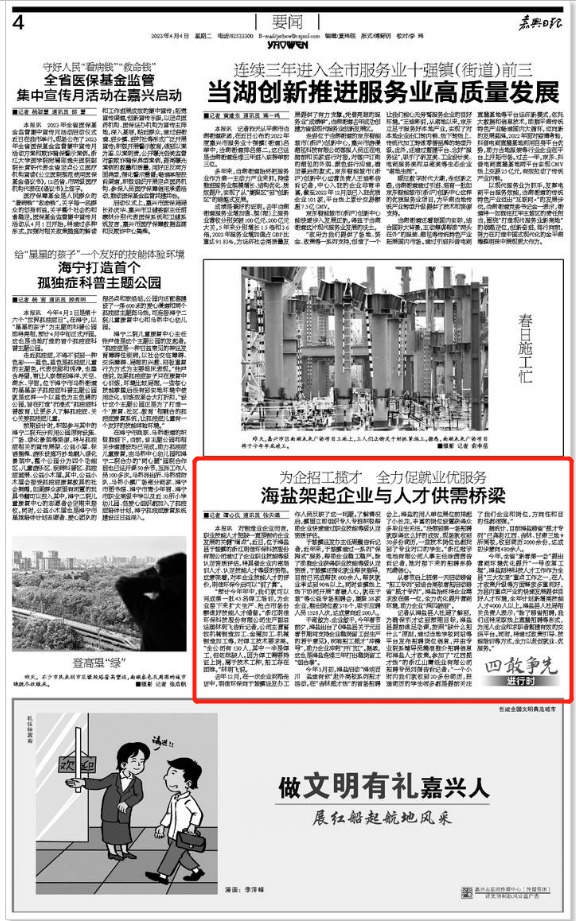 4月4日,《嘉兴日报》关注报道海盐为企招工揽才,全力促就业优服务,架起企业与人才供需桥梁。