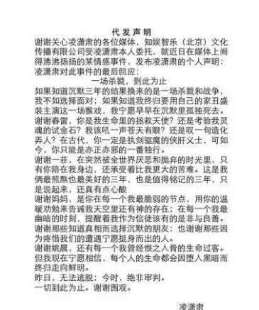 凌潇肃一方针对此事发表过声明,他在文章中默认姚晨曾婚内出轨,称曾经对其恨之入骨,而陪伴自己度过人生低谷的则是现任妻子唐一菲。