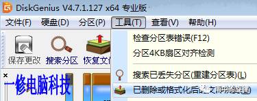 选中你要恢复数据的硬盘,然后菜单栏“工具”-“已删除或格式化后的文件恢复”。