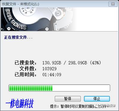 然后在弹出的窗口中选择开始就会扫描你的硬盘了。320GB的硬盘,累计花了3个小时,当然因为有坏道中间卡住了几次,大家可以预估一下时间。