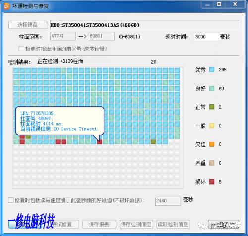 坏道非常严重了,个人觉得基本接近报废水平,物理坏道无法修复的,只能暂时屏蔽,但你无法组织它继续扩大。可能是我的盘已经病入膏肓了,使用修复功能时卡住了,大家可以试一下软件的坏道修复功能,只要不是很严重,应该是没问题的。