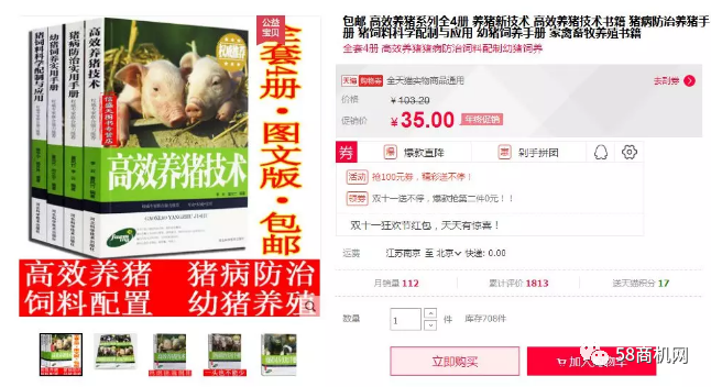 在某宝上面我也去搜索了一下,以现卖养猪教程的店铺并不是很多,销量好的一家店铺卖的教程书籍一月也有三四千元的收入。