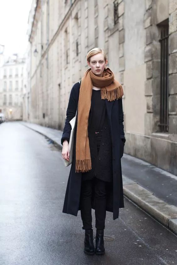 比如同样是穿一件黑色的大衣,但是有了不同颜色款式围巾的加持,就会有完全不一样的感觉。