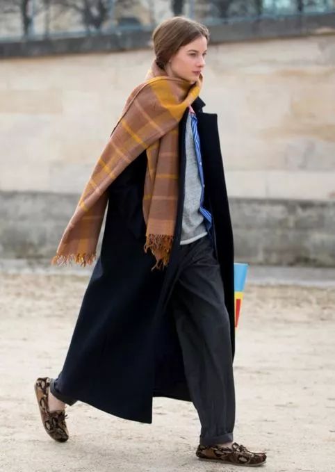 围巾和袜子的搭配,小细节处见功力。冬天露袜穿更时髦呀~这个方法可以好好运用起来。