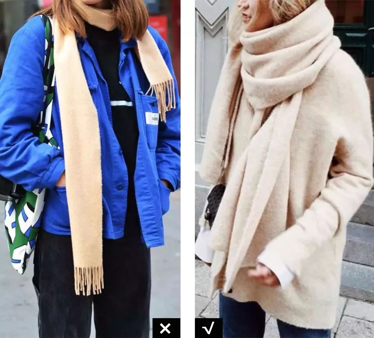 有时候围巾款式好看,但围上之后会发现过于短或窄,不仅显得有点局促,还不够挡风。这时候围巾就变得鸡肋,实用性不高,戴过几次就会被遗忘在角落。