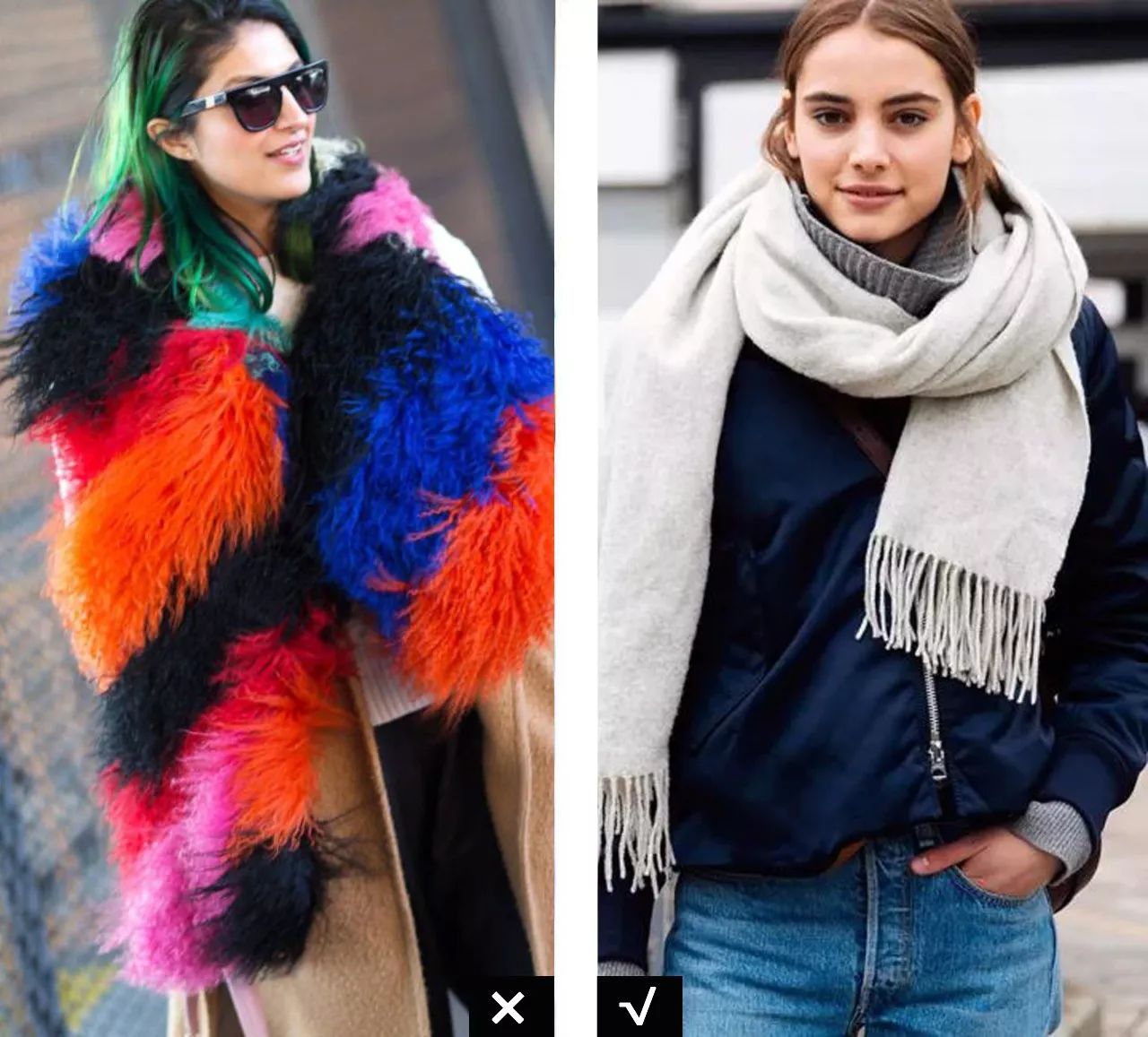 颜色方面,不建议太花哨。在冬天搭配外套,经典款围巾能让整身造型的质感都显得更高级。