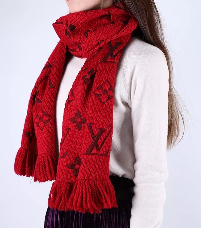 这款围巾是正方形,大家一般都会按对角线折叠成三角形佩戴。它整体都印有LV最经典的Monogram图案,老花爱好者们都会喜欢。