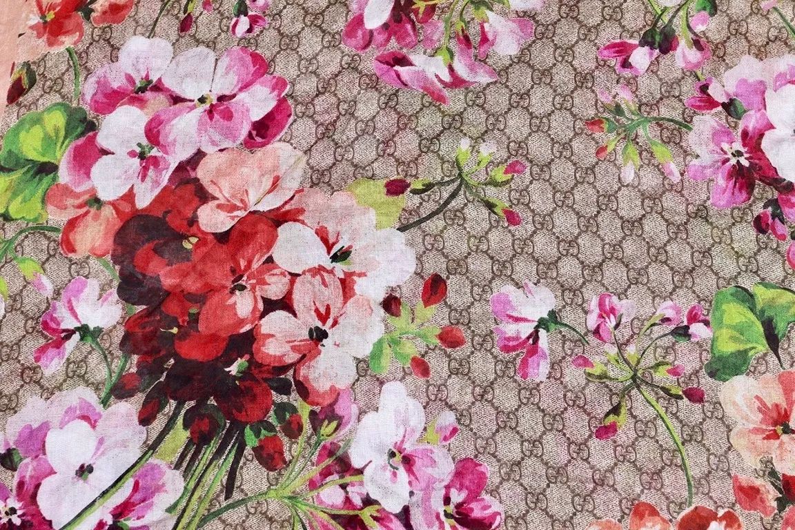 于是设计师很聪明地把这种印花用到了其他单品上,姐就被天竺葵的美貌诱惑了,剁手了这条Gucci Bloom围巾。
