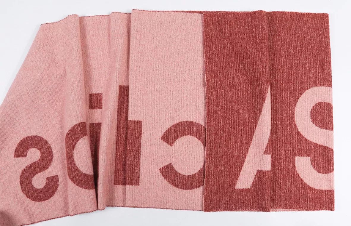 这款围巾正面是豆沙红,上面有Acne Studios的粉色超大logo。