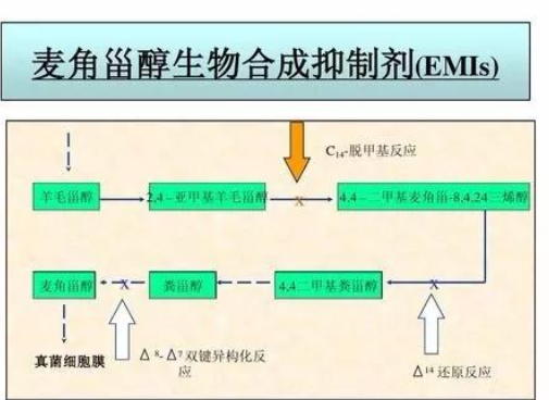 作用机理是影响甾醇类生物合成,使菌体细胞膜功能受到破坏,在植物体内抑制病菌的附着胞、吸器的正常发育,使菌丝生长、孢子的形成受阻。