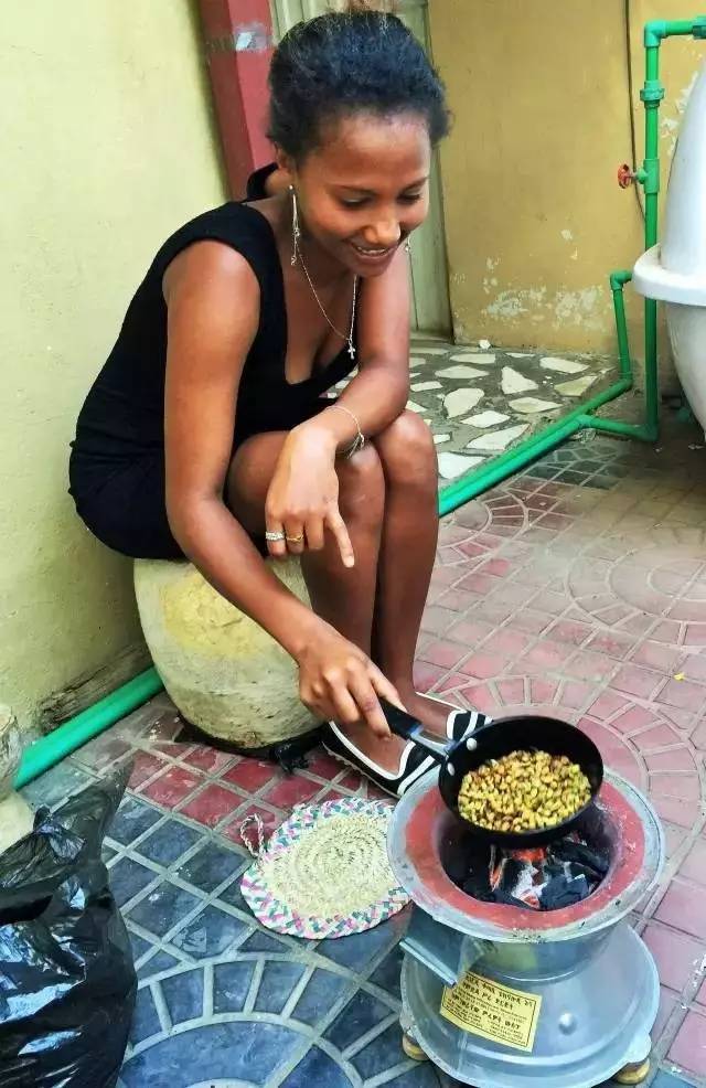 在这里似乎烹制咖啡就是妇女们的一项基本技能,从二十出头的少女到耄耋老人,整个过程都是手到擒来,非常熟练。司机大叔带我来到了当地人的市场购置了一整套做传统咖啡的装备。我认真地坐在小保姆的身旁,跃跃欲试地观摩整个过程。