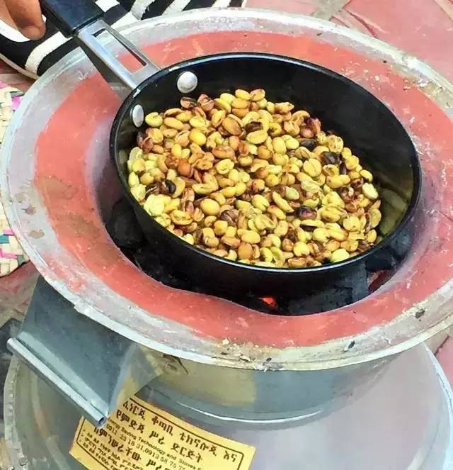 整个咖啡的烹制过程非常具有仪式感,当地人称之为“Coffee Ceremony”。首先要把豆子做简单的挑选,用水冲洗。选好的豆子完成了日晒的工艺,去皮,去肉,呈淡绿色,颗颗饱满。然后将豆子倒入一个状如平底锅的铁盘,放在炉火上,用铁铲不停地翻炒。炉火中会加入一些撒一些金黄色的乳香。几分钟后,咖啡豆逐渐呈现出浅褐的肉桂色,接着发出爆裂的劈啪声。渐渐的,豆子的颜色越来越深,油脂溢出,咖啡的香味也随之飘散开来。其实烘焙豆子是最具经验值的环节,一方面要保证豆子受热均匀,一方面要掌握火候,烘焙过浅,咖啡会有强烈的酸味,烘培过深,又会出现苦味。当咖啡呈现深褐色时,取出咖啡豆倒入石臼中,以杵捣碎,并研磨成尽量细的粉末,倒入已经温好的高颈陶壶中。这种陶壶叫做Jebena。Jebena的造型设计非常适合用来煮咖啡,圆底高颈尖嘴,是埃塞劳动人民的智慧结晶。在埃塞的许多地方都可以看到以Jebena为造型的雕塑和建筑。