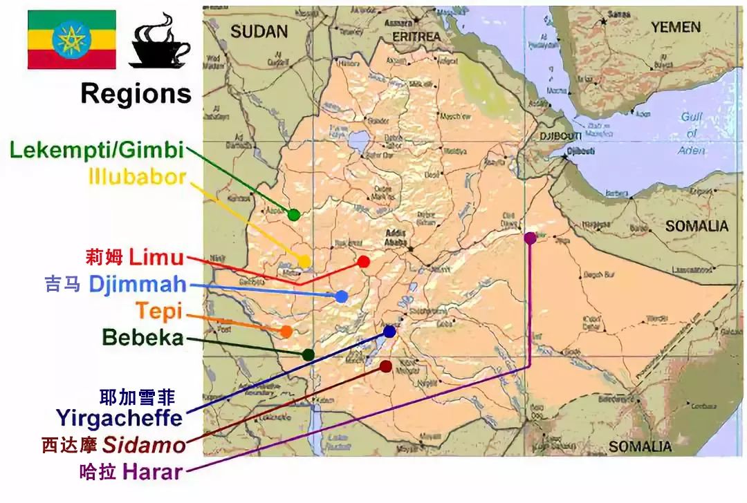 相关产地还有包括,平均海拔在1800米以上的古吉(Guji),以其优越的地理位置及杯测风味,于2010年被ECX(埃塞俄比亚商品交易所)单独成立为一个独立产区;吉玛(Djimmah),这是埃塞俄比亚咖啡产量最大的产区,占出口的1/3。