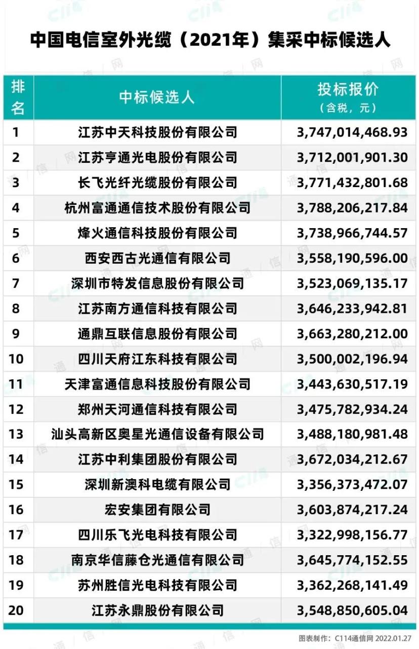 1月27日小米市值,中国电信公布室外光缆(2021年)集中采购项目中标候选人。经评审,中天、亨通、长飞、富通、烽火等20家厂商中标。