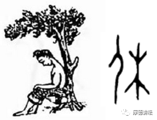 一人躺在树桩下休息。为什么是“休”字呢?请看图片。