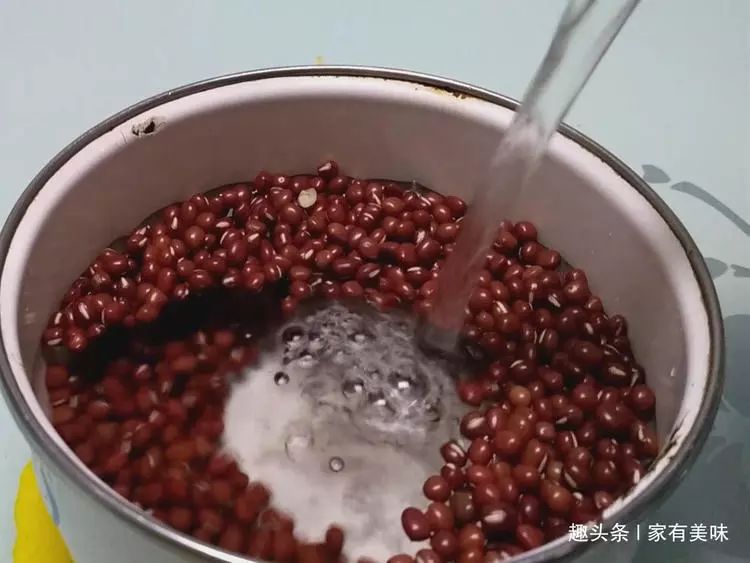 6、将煮好的红小豆放入锅中,加入适量的温水和红糖再次煮开。