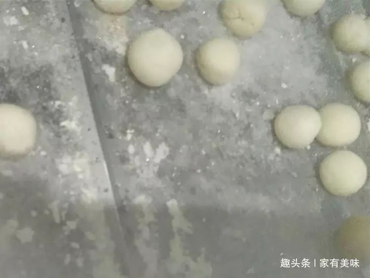 3、和成团后,再放案板上揉搓成长条,用手楸起1小块,团成小丸子。
