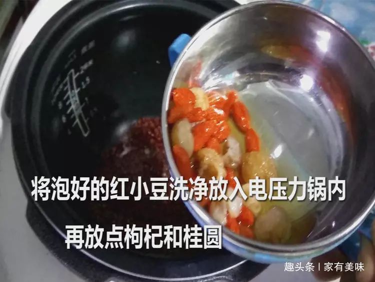 5、红小豆泡发好后,连同清水一起放入电压力锅中,再将枸杞和桂圆也放进去,按下杂粮键,将其煮熟。可在前一天晚上提前预约熬粥,早上起来直接做就可以了。