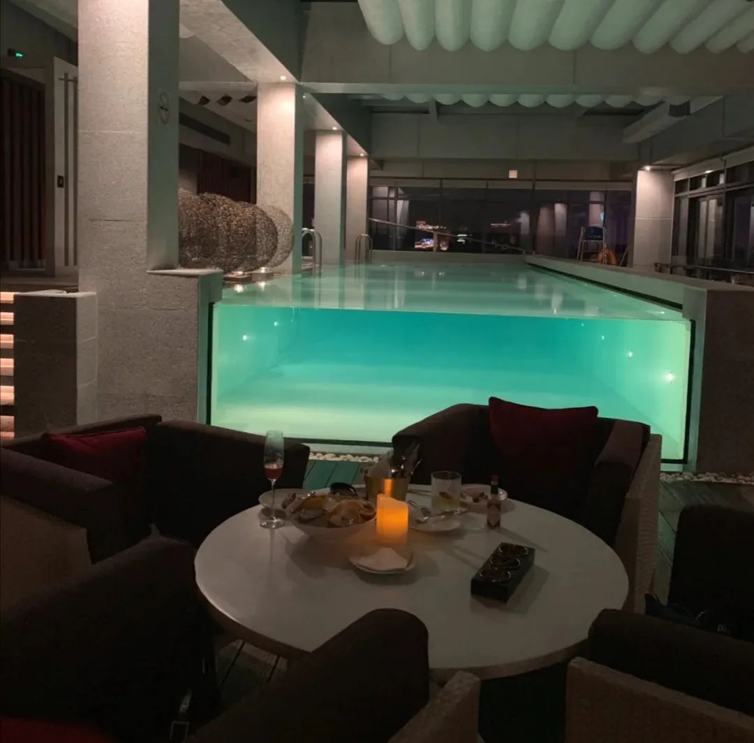 很适合约会的场所,因为就在酒吧里面,餐桌就正对着泳池,点上香薰蜡烛,瞬间营造出浪漫的氛围。