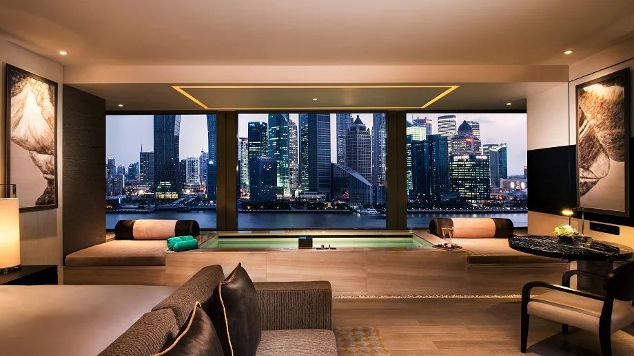 房间里的恒温泳池绝对是魔都经典网红打卡点,无论是白天还是晚上拍照都很有高级质感,对面就是一整片玻璃可以直观整个陆家嘴,躺在泳池里喝香槟,吃美食都是种别样的享受~