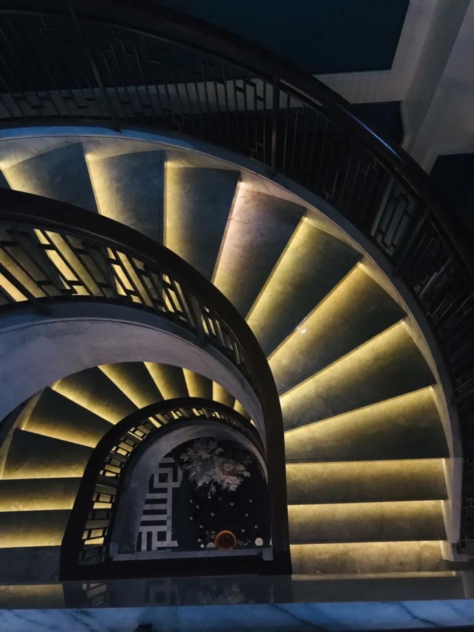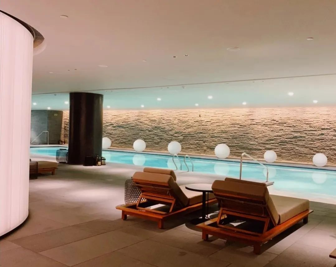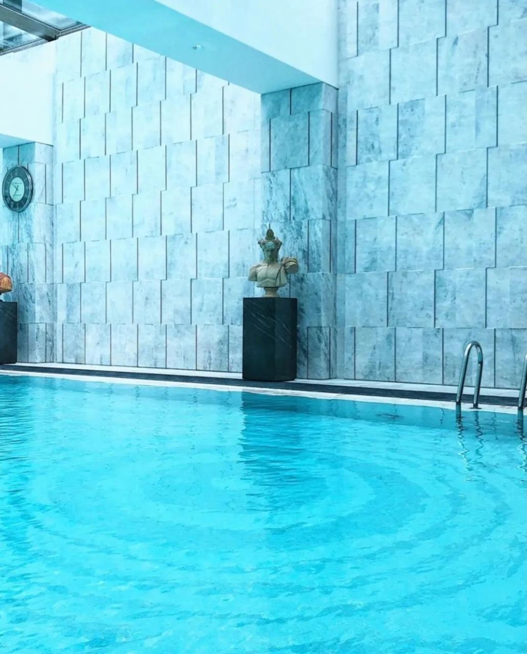 恒温泳池在酒店的三楼,横跨两层的泳池还模仿了影院的构造,在入口处设置了仪式感十足的阶梯。