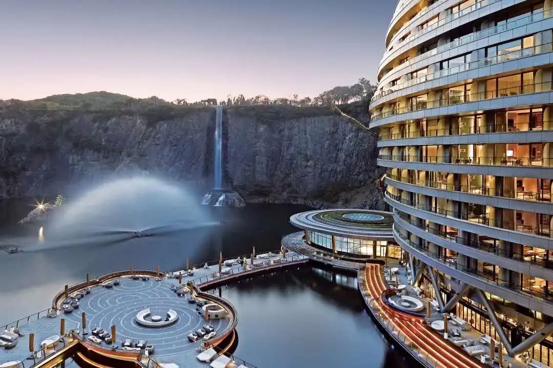 全球唯一一家深坑酒店,下探地表88米,依附深坑崖壁而建,被美国国家地理誉为是“世界建筑奇迹”。