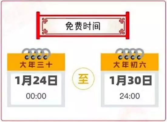 春节:1月24日(除夕)零点开始,至1月30日(初六)24时结束,高速共免费7天。