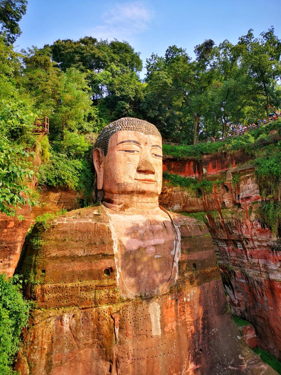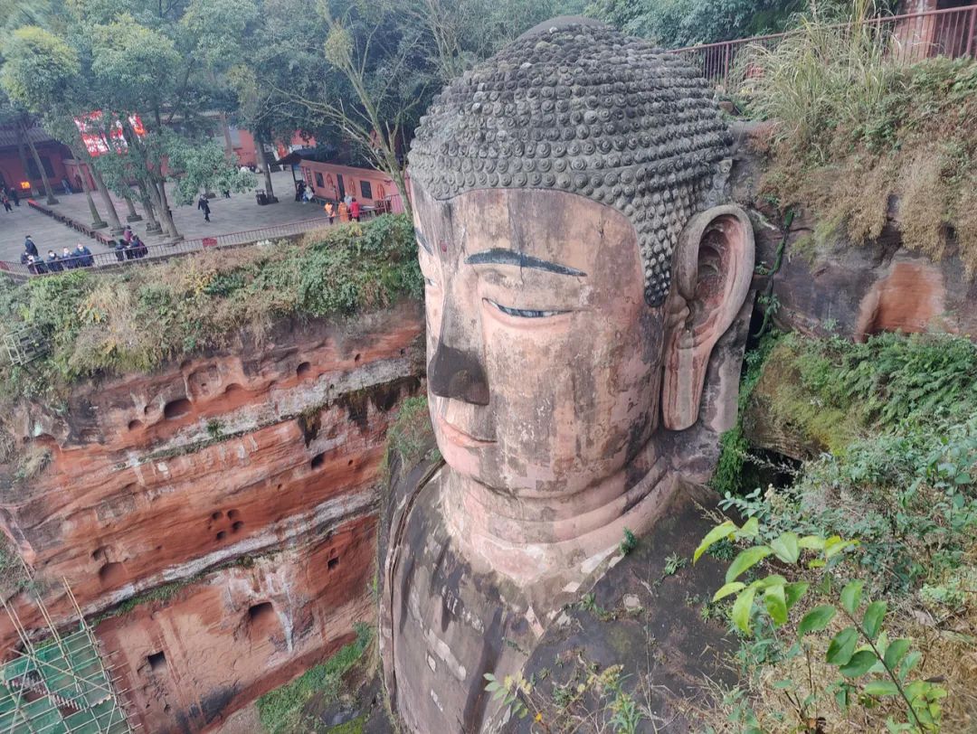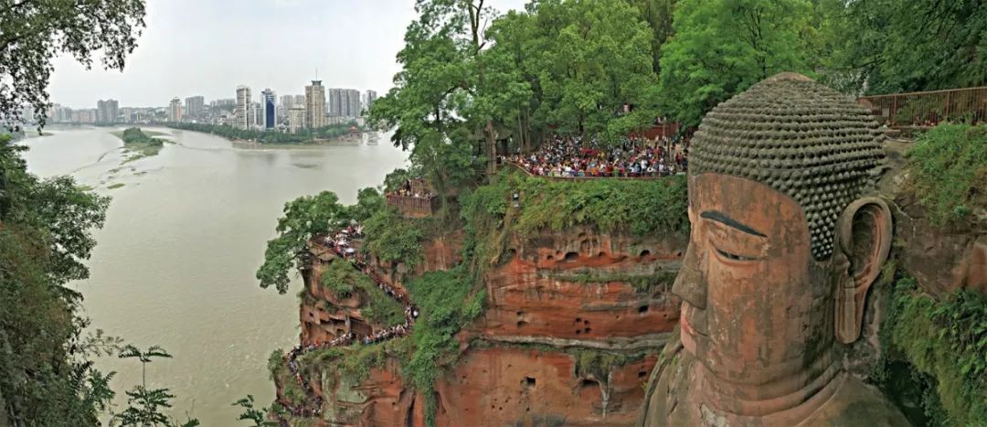 “佛是一座山,山是一座佛。”乐山大佛素来有这一美称。远远望去,凌云山峭壁爬满了绿植,把乐山大佛裹挟其间,大佛始终是凌云山的一部分。
