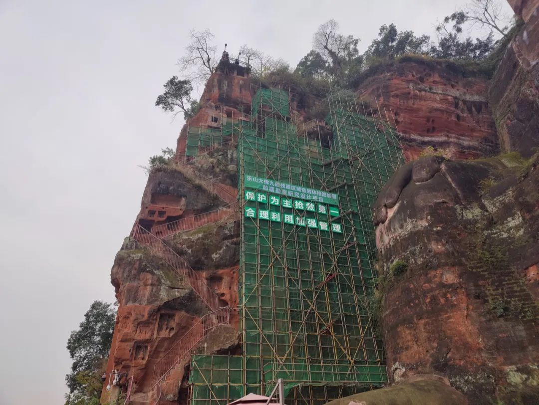 此项目名为“乐山大佛九曲栈道区域危岩体抢险加固前期勘察研究涉及项目”,据央视新闻报道,九曲栈道崖壁脚手架已经全部搭设完成,勘查研究所需的裂缝计、震动测量仪等勘测仪器都已安装到位,开始大数据采集工作。