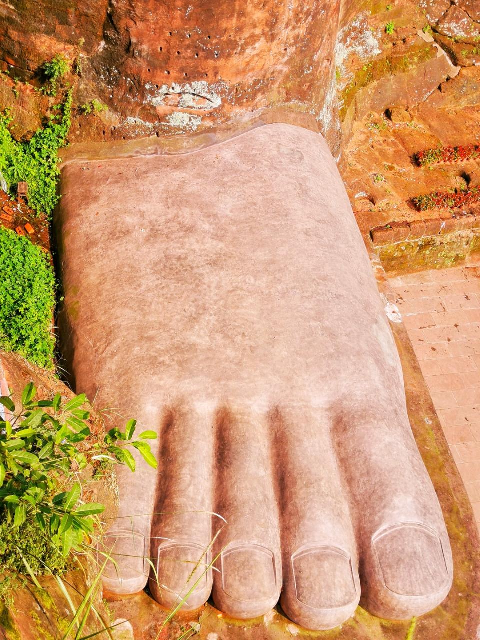 这是拥有1300余年历史的乐山大佛,是世界最大的石刻弥勒佛坐像。1996年,乐山大佛被联合国教科文组织列入世界自然与文化遗产名录。大佛头与山齐,脚踏江水,坐镇于浪急水旋的行舟之患处,在越度千年的时间里,眉目低垂地与乐山城隔江对视。