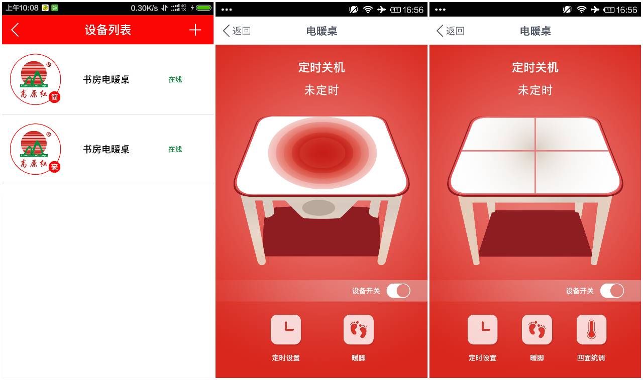 司南物联为高原红智能电暖桌全新打造一套“前端模块 + UI 设计 + APP 开发”的物联网整体解决方案。电暖桌嵌入司南物联 SNIOT505 模块,并集成通信协议,轻松应对各种复杂的网络环境。用户可采用 APP对电暖桌远程遥控开关及调温,智能定时,控温随心所欲。