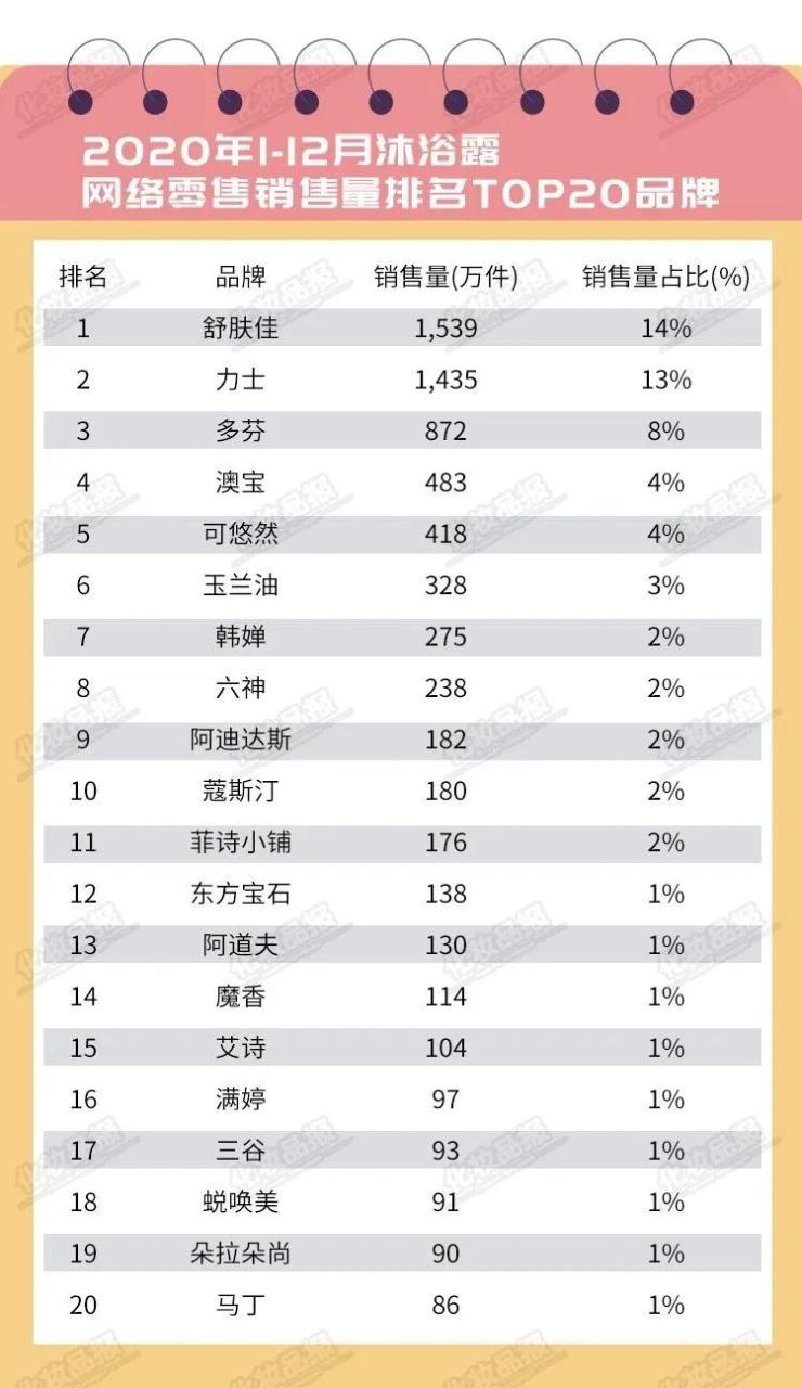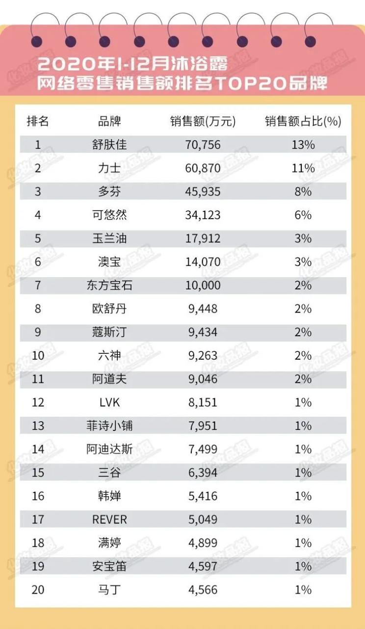 维恩咨询数据显示,2020年,澳宝凭借近1.5亿元的销售额、近500万件的销量,成为线上最畅销的本土沐浴露品牌。此外,在线上沐浴市场的TOP20品牌中,本土品牌占一半,六神、蔻斯汀、阿道夫、LVK等均达成了近亿元的销售额。