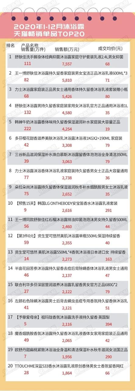 维恩咨询数据显示,2020年全年,国内沐浴露线上总销售额为55亿元,同比2019年增长超30%,成交均价49元,销量超1亿件。除去受大促拉动销售较多的11月份外,6月是去年全年沐浴露需求量最高的时间段,单月销量超1300万件,销售额超6.5亿元。