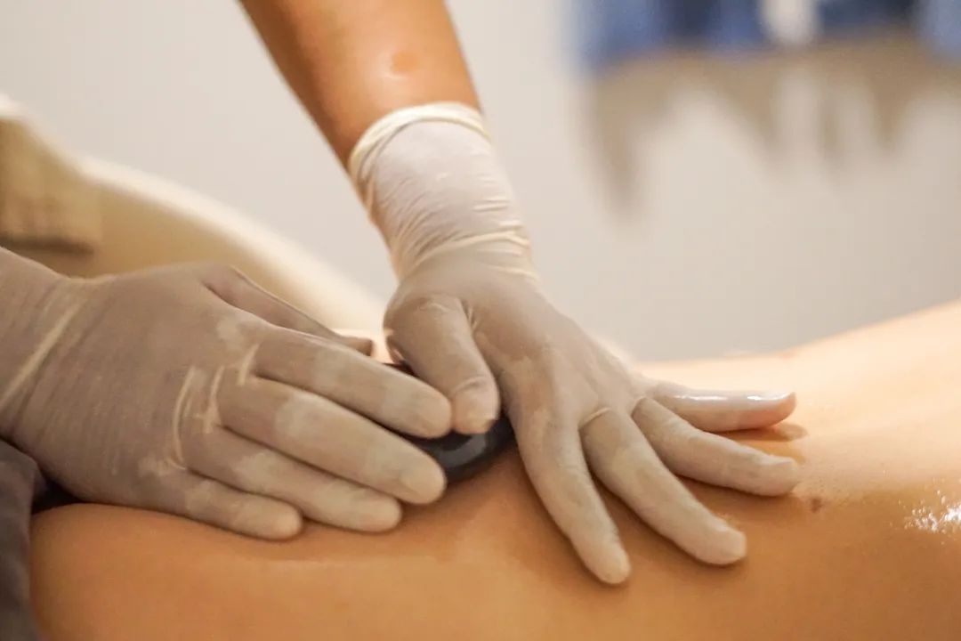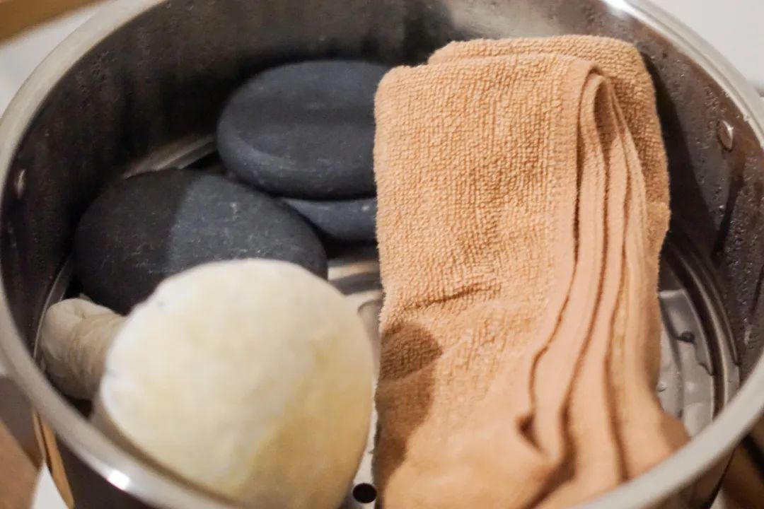 而是先蒸(一可以消毒、二可以传热)好了火山石,再用手转动火山石,使按摩师手心导热,最后再按在我的身上,待到火山石不那么烫的时候就可以直接放在身上按。
