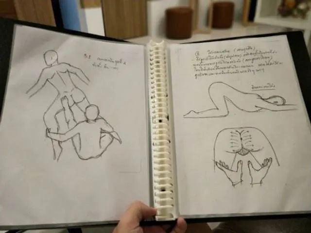 背面按完之后,按摩师示意我把臀部撅起来。如下手绘图右上姿势学名叫“膝胸式”。