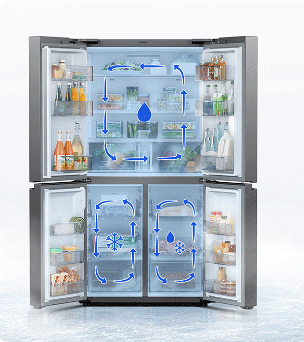 此外,为了保证冰箱内部不串味,三星品道私厨冰箱(型号为RF50N5940FS/SC )还创新采用了无霜保湿三循环制冷系统,冷藏室,冷冻室和宽带变温室三个间室在独立循环的同时精确控温,从而为其524L大容量保鲜空间的卓越保鲜体验提供了技术保障。