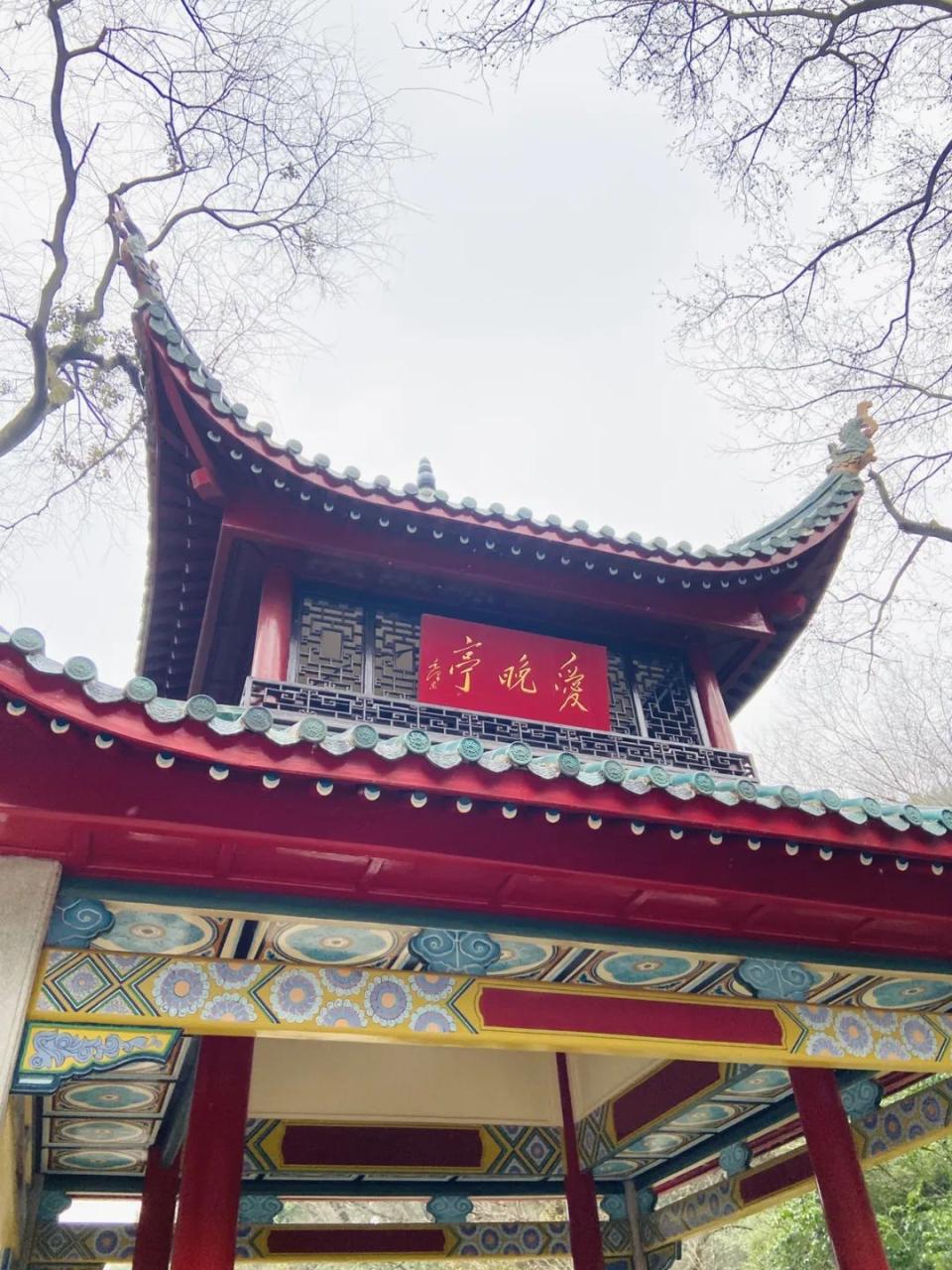 爱晚亭与陶然亭、湖心亭、醉翁亭并称中国四大名亭,也是革命活动胜地,为湖南省文物保护单位。亭形为重檐八柱,琉璃碧瓦,亭角飞翘,自远处观之似凌空欲飞状。内为丹漆园柱,外檐四石柱为花岗岩,亭中彩绘藻井,东西两面亭棂悬以红底鎏金“爱晚亭”,是由当时的湖南大学校长李达专函请毛泽东所书手迹而制。