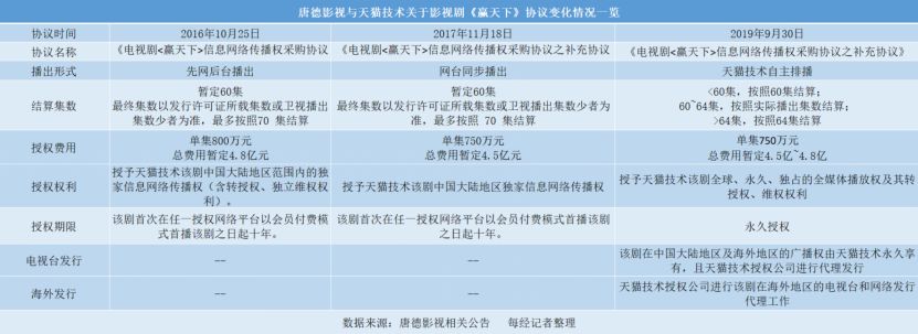 2017年11月18日,双方签订补充协议,约定该剧播出形式变更为“网台同步播出”;如该剧最终在湖南卫视黄金档首轮播出,则维持原单集授权费用不变;如该剧最终在江苏卫视、东方卫视黄金档拼播首轮播出,则该剧单集授权费用调整为750万元,该剧暂定60集,总费用合计4.5亿元。