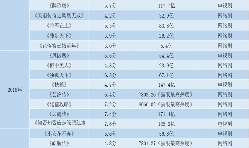 数量纵然可观,但质量却并不尽如人意。在上述30部大女主古装剧中,豆瓣评分在及格线之上的仅仅14部,最低的评分仅3.0分。另一方面,从近年来古装剧的播出形式,也不难看出市场对于大女主古装剧的一些态度。