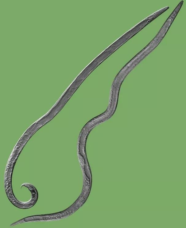松树变红死去的罪魁祸首——松材线虫,它们体长为1mm左右。男(雄)左女(雌)右 | 宁波出入境检验检疫技术中心