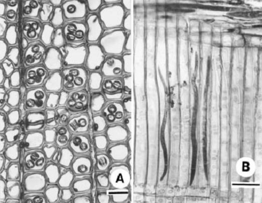 松树管胞中的松材线虫 左图:横切面 右图:纵切图 | 参考文献[3]
