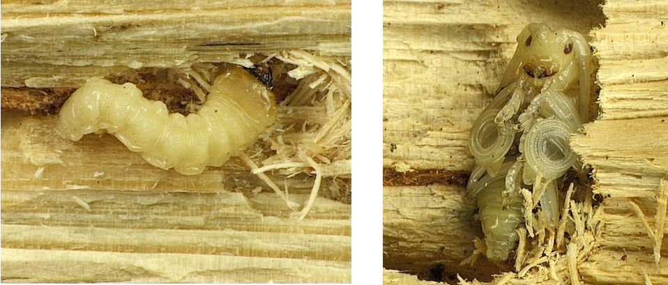 待到天牛羽化成熟时,就带着松材线虫去浪迹天涯,开启新的征程。松墨天牛宝宝。左:幼虫 右:离蛹 | 波兰国家植保所