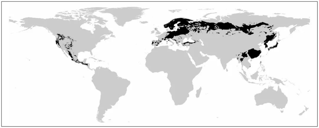 随着全球气温进一步升高,黑色所示的区域都将会是或者已经是松材线虫病的重灾区 | 参考文献[5]