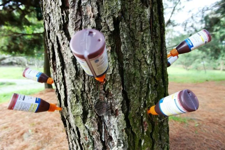 松树挂吊瓶现已全面升级为插瓶子了,瓶内药液为阿维菌素乳油,一款优秀的杀线虫药剂 | 杭州热心市民