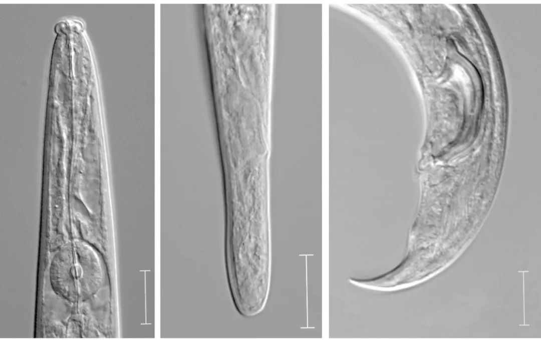 今年10月从美国进口的原木中截获的松材线虫照片,分别为头部,雌虫尾部和雄虫尾部的特征。标尺= 10 um | 宁波出入境检验检疫技术中心