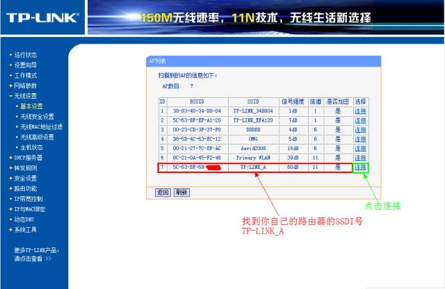 勾选「开启WDS」,在弹出的界面点击扫瞄,得到AP列表以后找到主路由器的SSID,即TP_LINK-A,点击右边的「连接」按钮,会回到先前的界面,加密方式选WPA-PSK,密钥填12345678,(保持与主路由器一致即可),保存